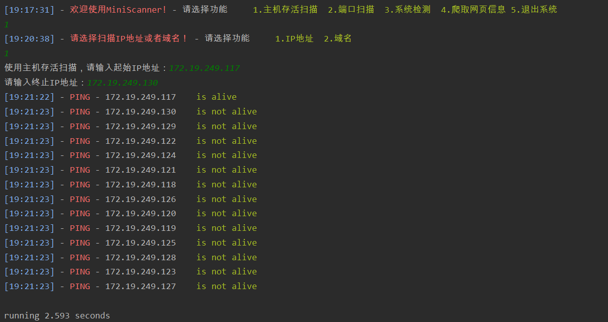 用户可以选择输入起始IP地址和终止IP地址,针对区间内所有的IP地址,系统采用基础的ping命令验证对应主机是否存活并打印出结果,结果保存到数据库中。在此基础上,针对用户可能输入的域名进行域名解析后再使用ping命令,并且系统会禁止对敏感域名的扫描。为提高程序运行速度,采用了线程池来执行扫描任务。