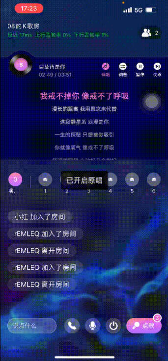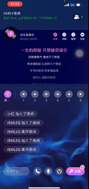 KTV房间里,用户点歌,跟随音乐演唱歌曲并与其他用户进行音视频实时互动。